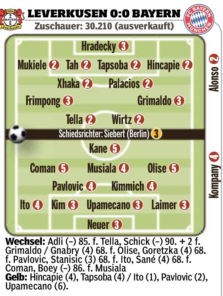 2月16日訊 德甲第22輪比賽,勒沃庫森主場(chǎng)0-0戰(zhàn)平拜仁,德國媒體《圖片報(bào)》對(duì)兩隊(duì)球員進(jìn)行了評(píng)分。