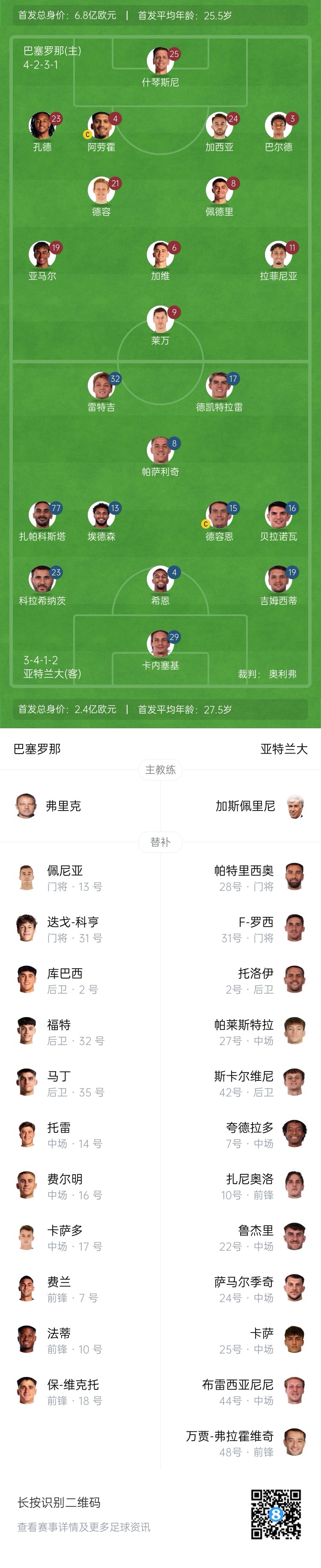 巴薩首發(fā):25-什琴斯尼、3-巴爾德、4-阿勞霍、23-孔德、24-埃里克-加西亞、6-加維、8-佩德里、21-德容、11-拉菲尼亞、19-亞馬爾、9-萊萬