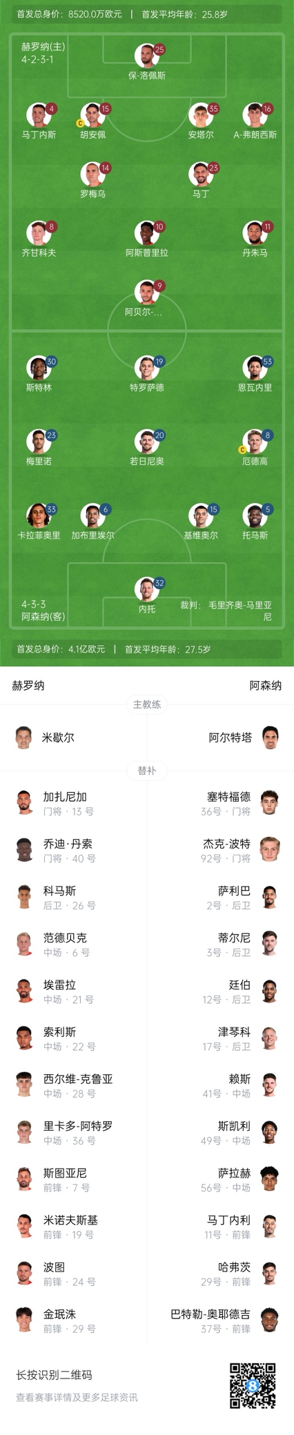 赫羅納首發(fā):25-保-洛佩斯、4-阿爾瑙-馬丁內(nèi)斯、35-雅各比什維利、15-胡安佩、16-亞歷杭德羅-弗朗西斯、14-羅梅烏、23-伊萬-馬丁、8-齊甘科夫、10-阿斯普里拉、11-丹朱馬、9-阿貝爾-魯伊斯