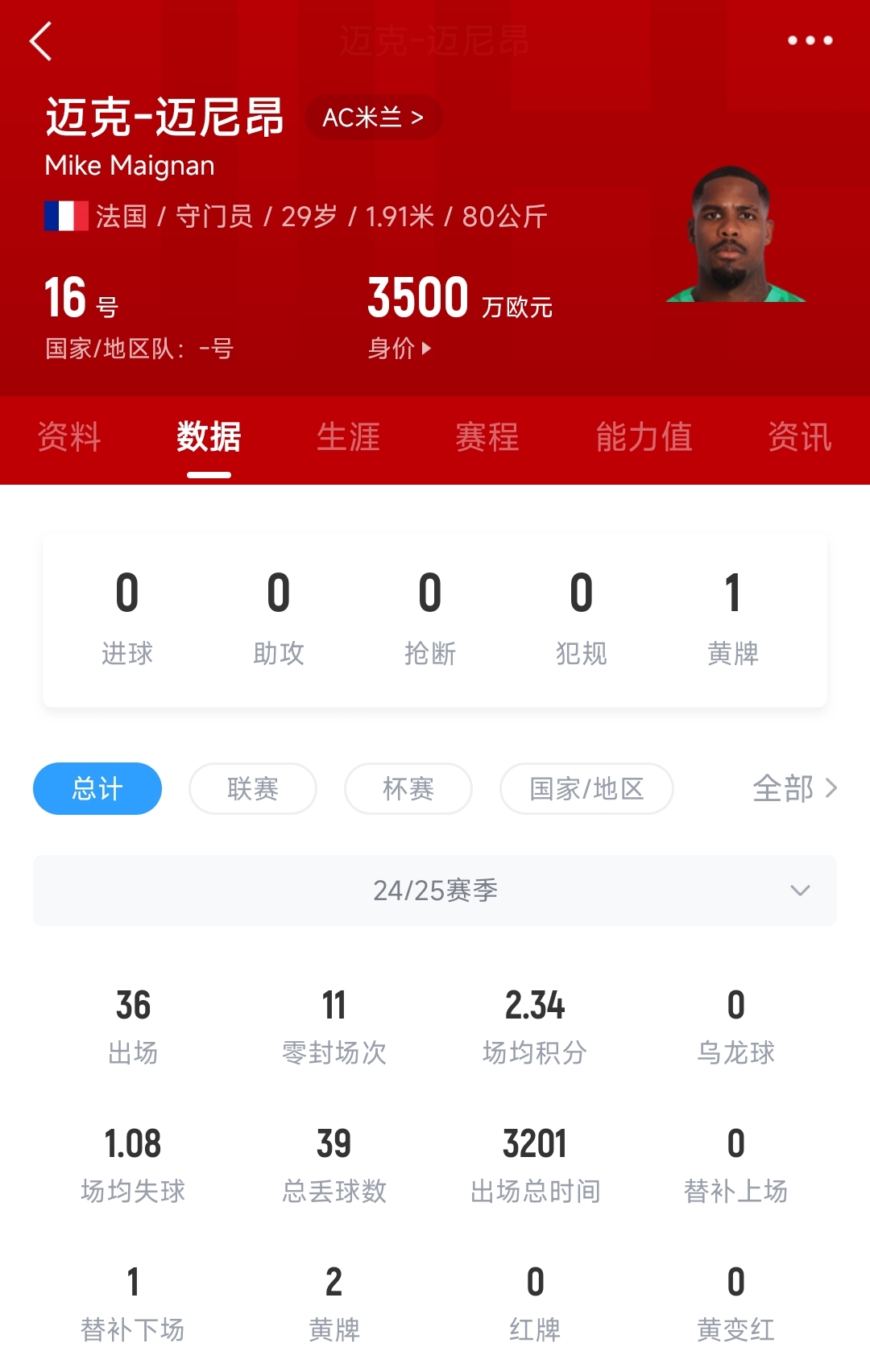 本賽季邁尼昂代表米蘭出戰(zhàn)36場比賽丟39球,完成11次零封。邁尼昂與米蘭的現有合同將在2026年6月到期,他在米蘭的稅后年薪為280萬歐元。續(xù)約后500萬歐的年薪,將使邁尼昂與萊奧持平,成為米蘭隊內薪水最高的球員。