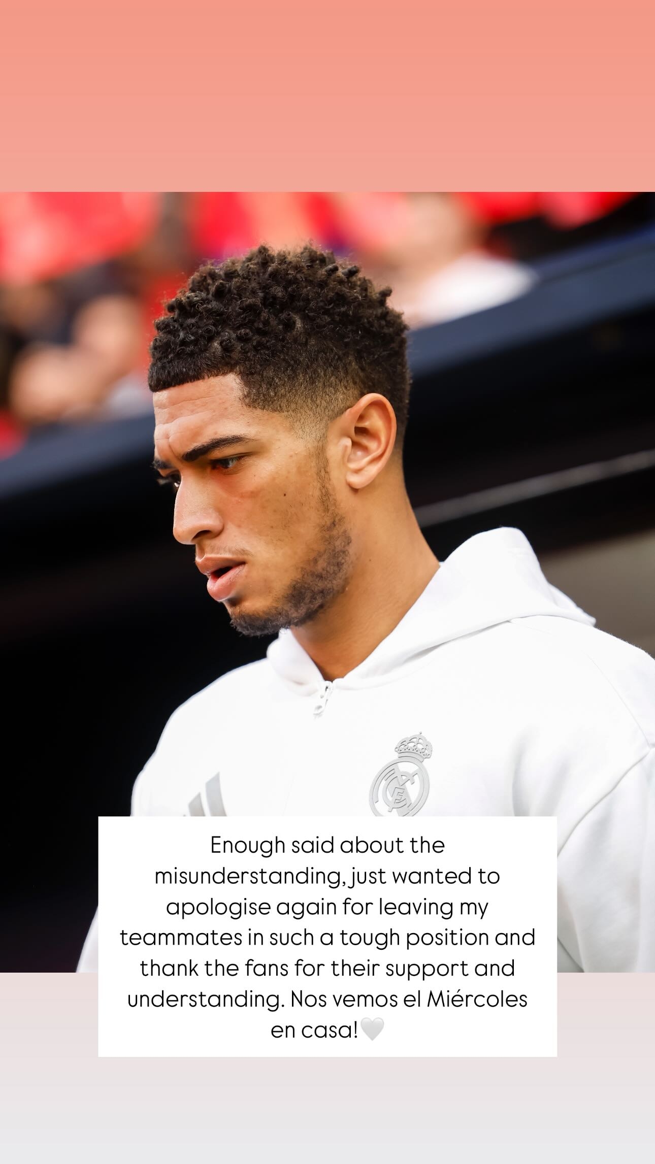 貝林厄姆:“關(guān)于這場誤會,已經(jīng)說得夠多了,現(xiàn)在我只想再次為讓隊(duì)友們陷入如此艱難的境地而道歉, 也感謝球迷們的支持與理解。周三主場見(歐冠對陣曼城)!”