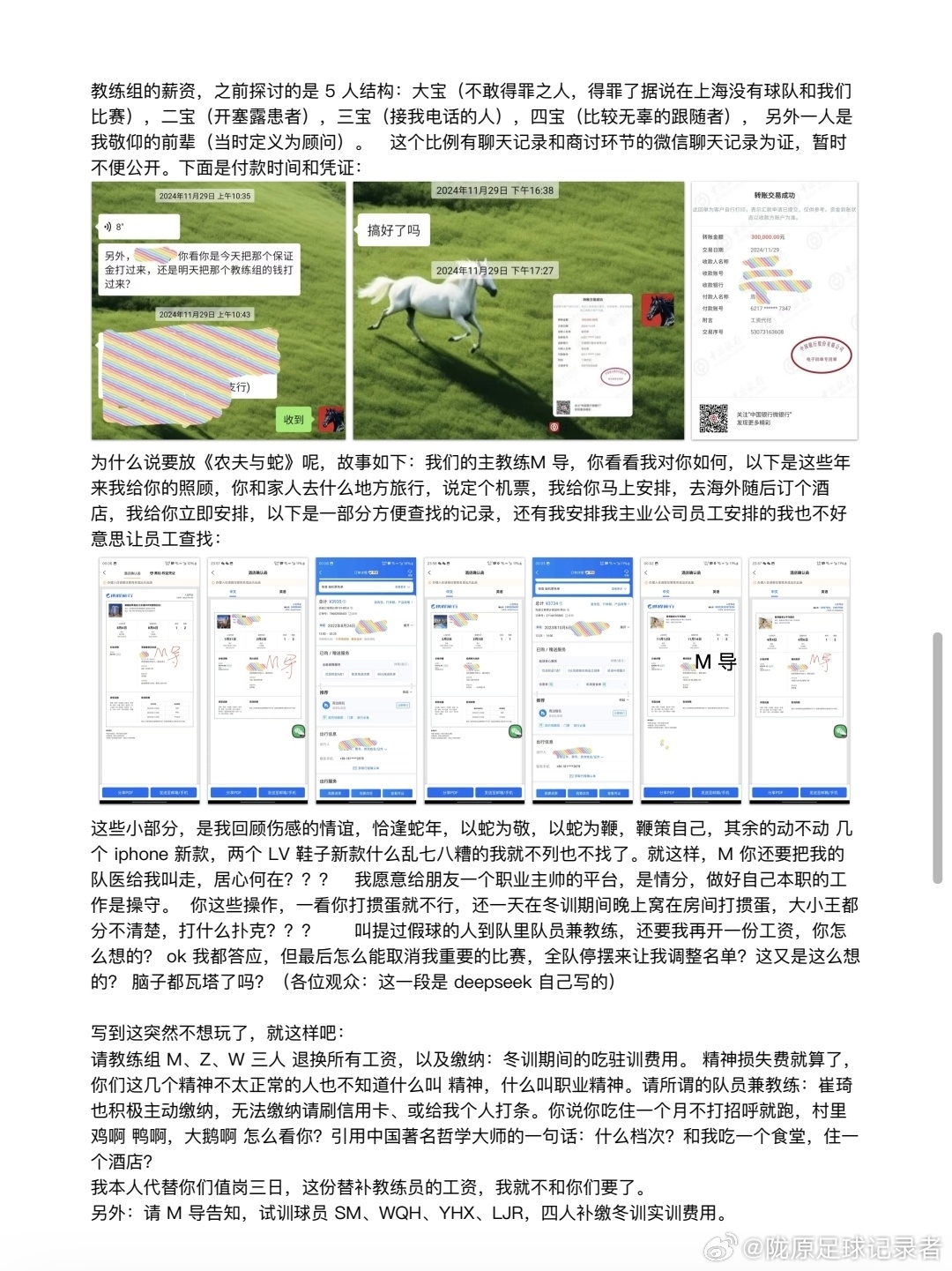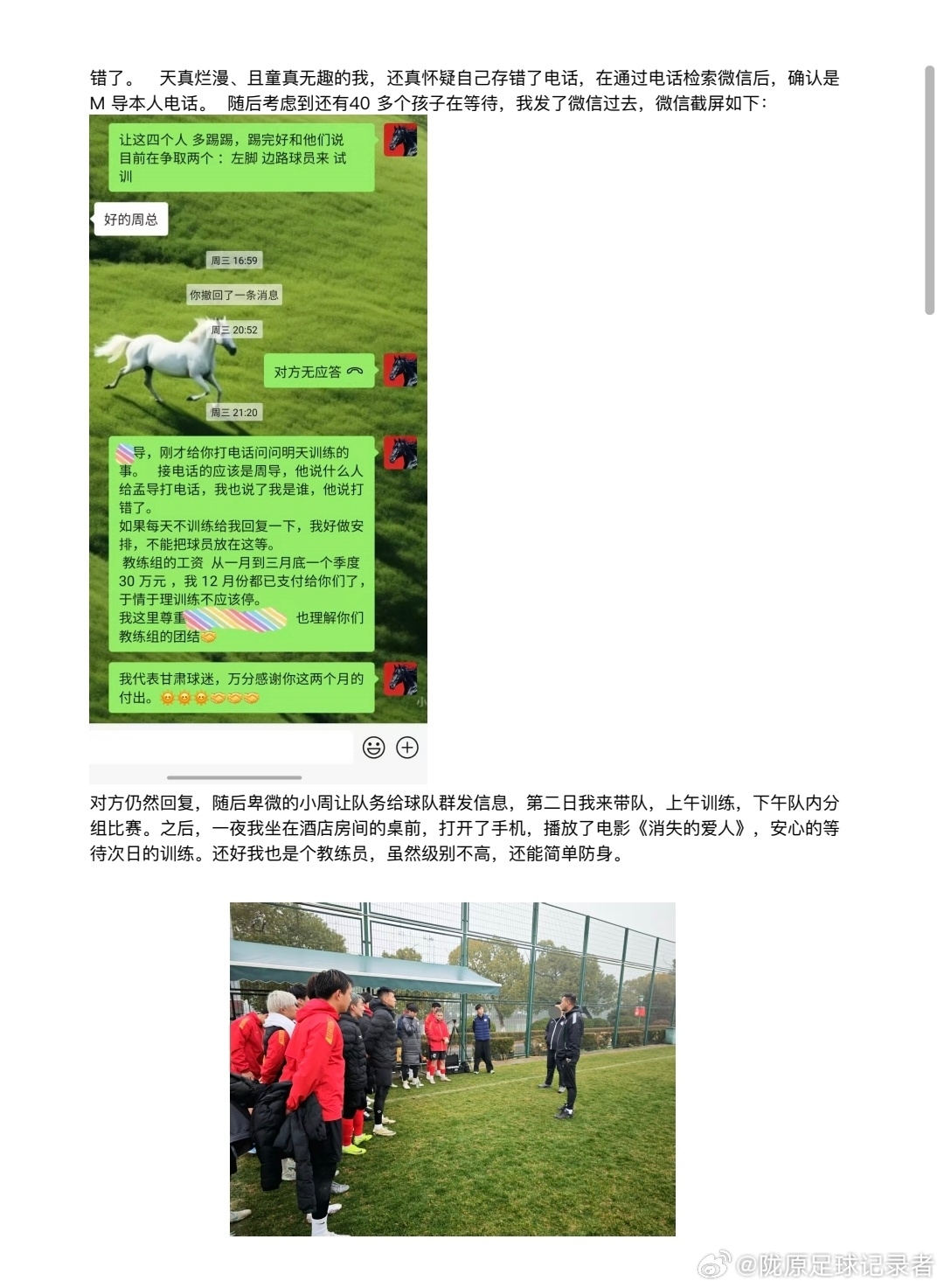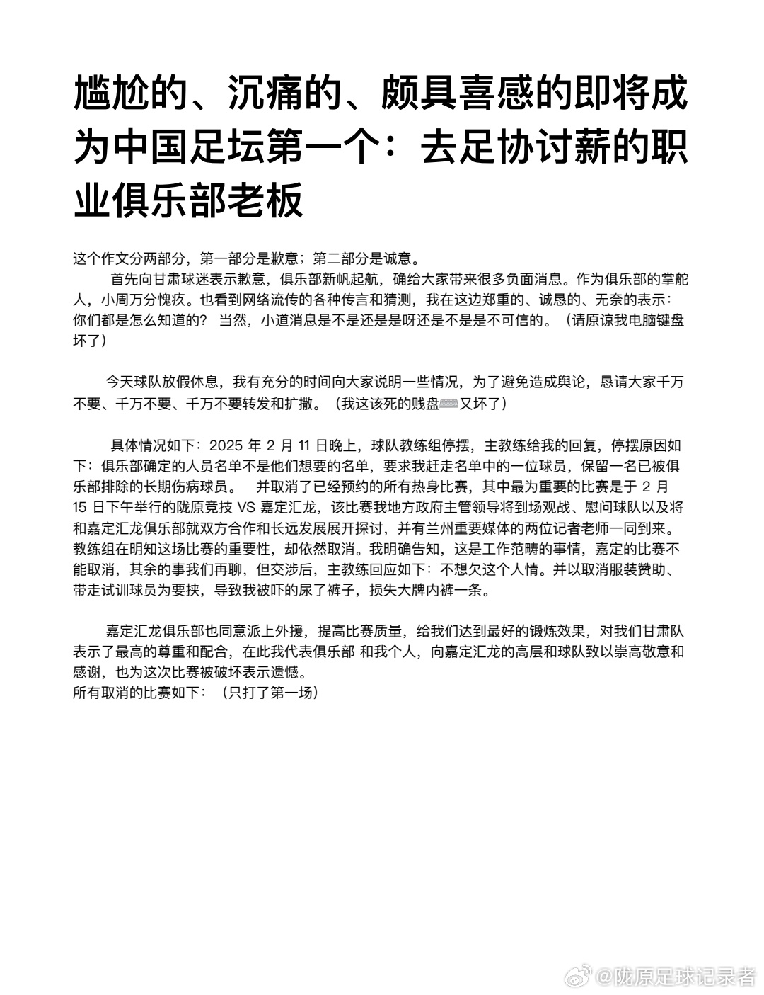 博主寫道:“蘭州隴原競(jìng)技足球俱樂部遭遇內(nèi)部風(fēng)波,教練組因投資人不同意引進(jìn)一名長(zhǎng)期處于傷病狀態(tài)的球員而集體停擺失聯(lián),熱身賽被取消,一季度預(yù)付的工資尚未退回?!边@種狗血的事情讓我們年輕的蘭州球隊(duì)遇到了,支持俱樂部周總維護(hù)自身和俱樂部的合法權(quán)益,抵制中國足球圈的糟爛人情世故亂象,呼吁那些不熱愛中國足球的沒有多少文化的酒蒙子,寄生蟲們滾出足球圈!