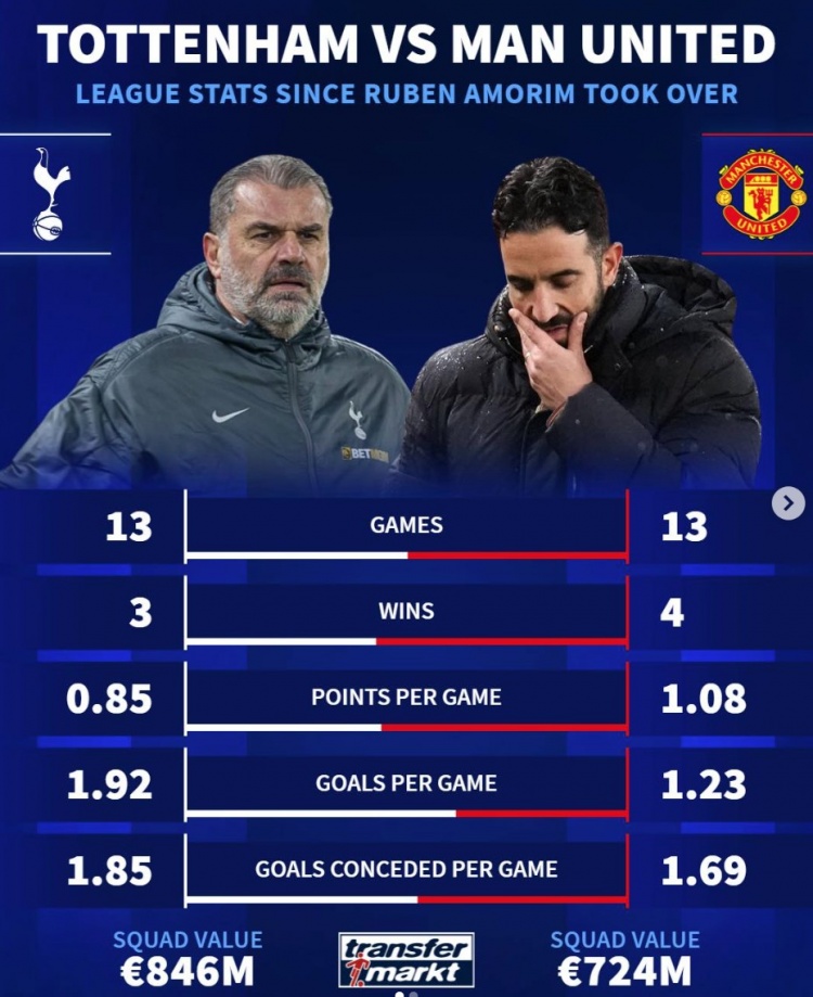 2月17日訊 本輪英超焦點戰(zhàn),兩支本賽季狀態(tài)同樣糟糕的BIG6球隊狹路相逢。數(shù)據(jù)統(tǒng)計顯示,自阿莫林接手曼聯(lián)以來,紅魔英超近13輪僅4勝,場均1.08分、打進1.23球、丟1.69球;而澳波同期帶領(lǐng)熱刺13輪僅3勝,場均0.85分、打進1.92球、丟1.85球。 本文標簽: 足球 英超 曼聯(lián) 熱刺