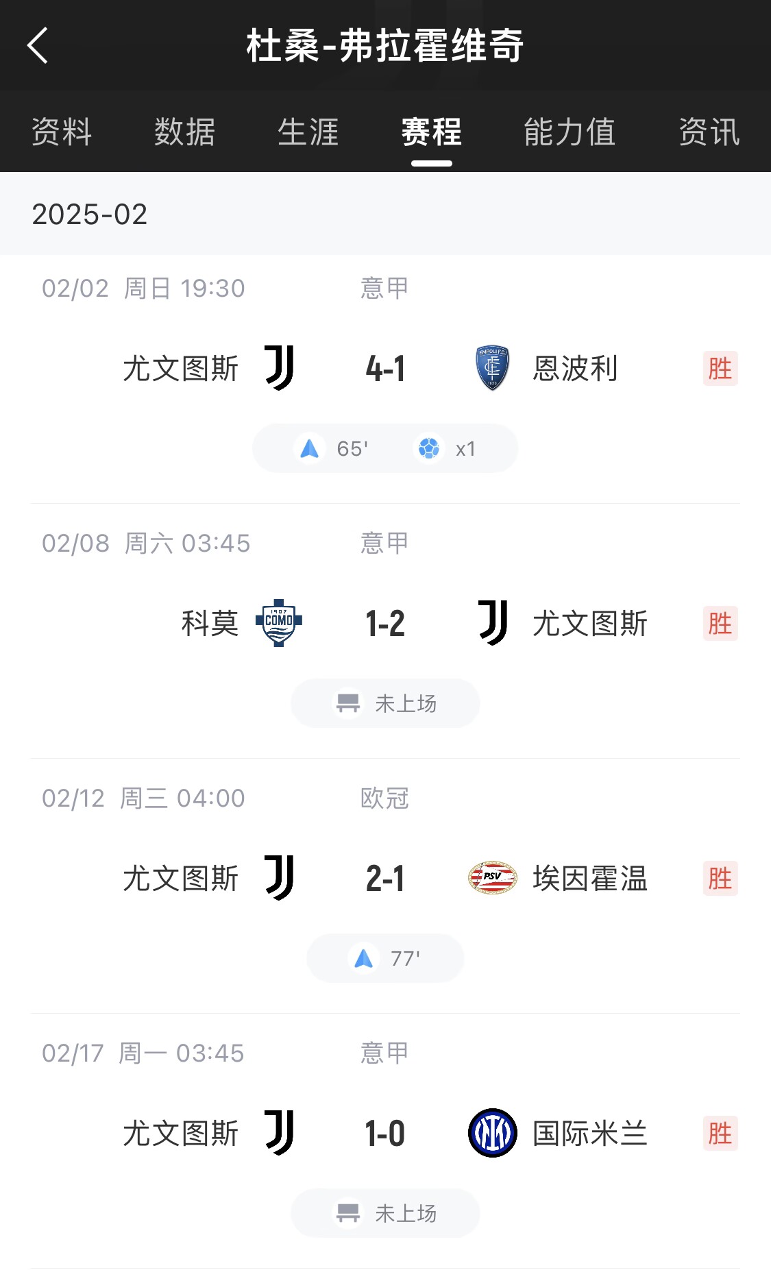 2月份至今尤文的4場(chǎng)比賽,弗拉霍維奇2場(chǎng)未登場(chǎng),2場(chǎng)替補(bǔ),打入1球。