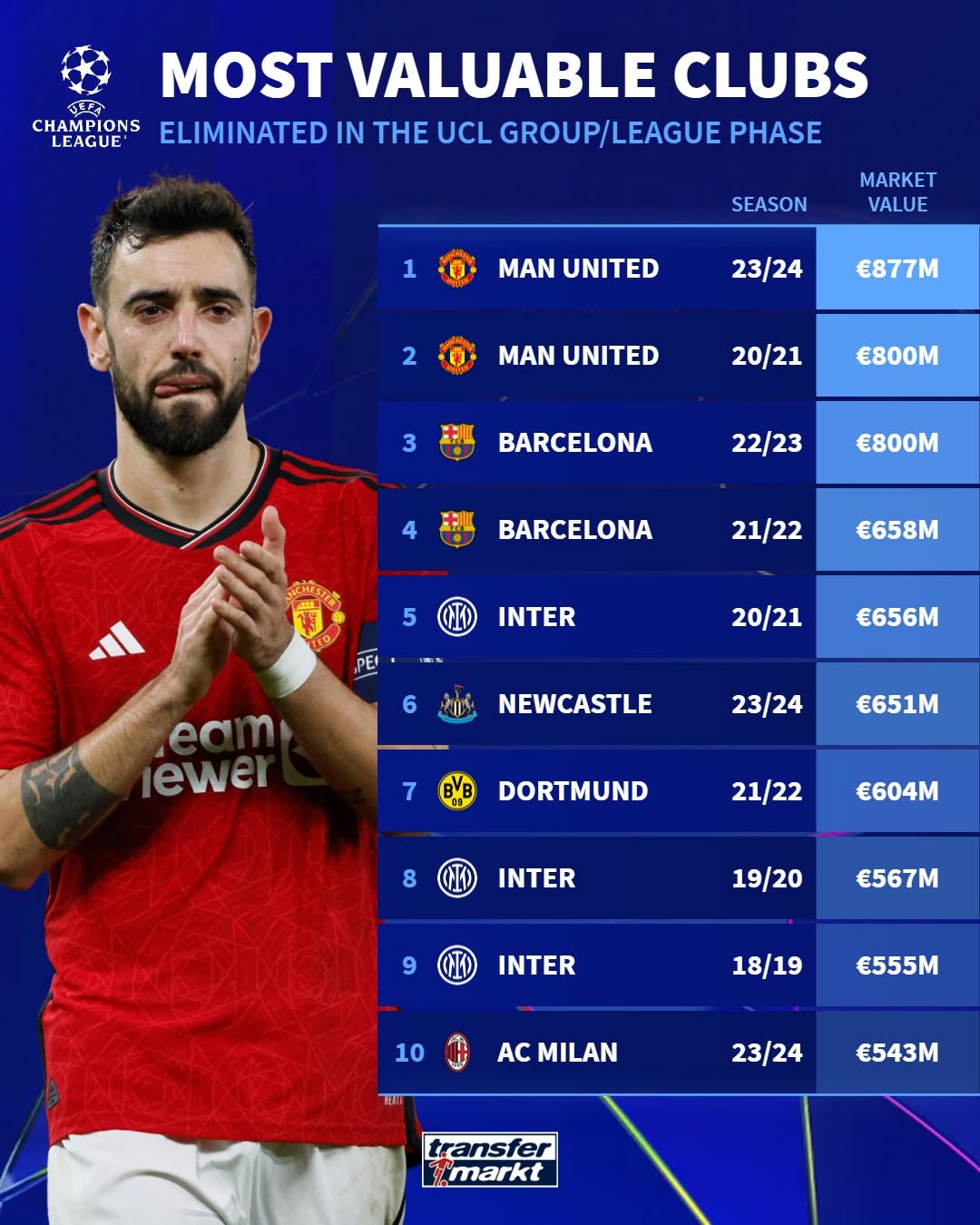 歐冠小組賽被淘汰的身價(jià)最貴球隊(duì):