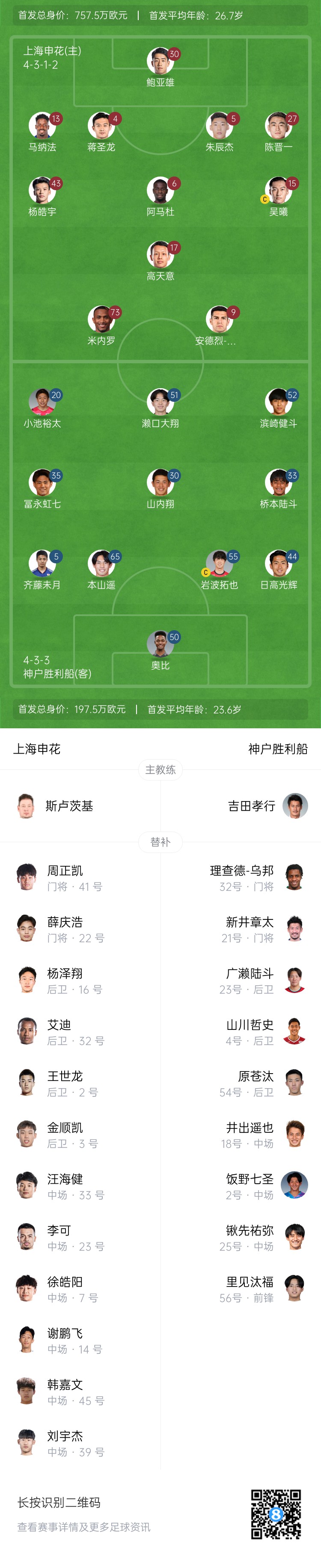 2月18日訊 北京時間今晚20點(diǎn),亞冠精英聯(lián)賽東亞區(qū)第8輪,上海申花主場迎戰(zhàn)神戶勝利船,賽前兩隊(duì)公布首發(fā)陣容。