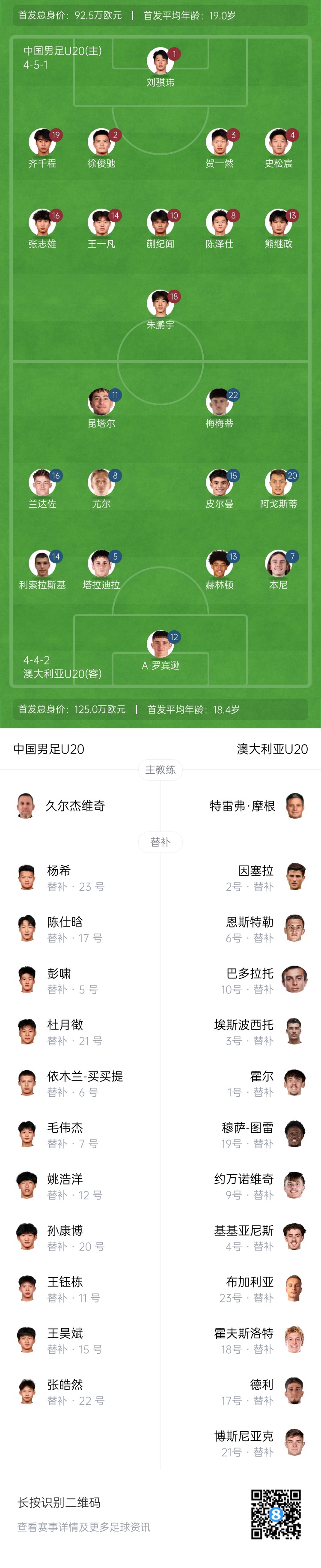 2月18日訊 北京時間19點30分,U20亞洲杯小組賽A組第三輪,中國vs澳大利亞,賽前雙方首發(fā)公布!本場比賽劉誠宇因累積黃牌停賽,較上場比賽國青首發(fā)更換6人,澳大利亞則更換了9人。