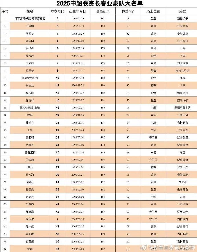 2025長(zhǎng)春亞泰大名單出爐 第12人繼續(xù)專屬12號(hào) 全隊(duì)平均年齡為26.9歲