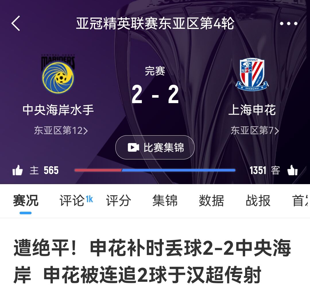 在對(duì)陣倒數(shù)第一中央海岸水手時(shí),申花在比賽最后時(shí)刻被對(duì)手絕平,送給中央海岸水手本屆亞冠首個(gè)積分,也是唯一的積分↓