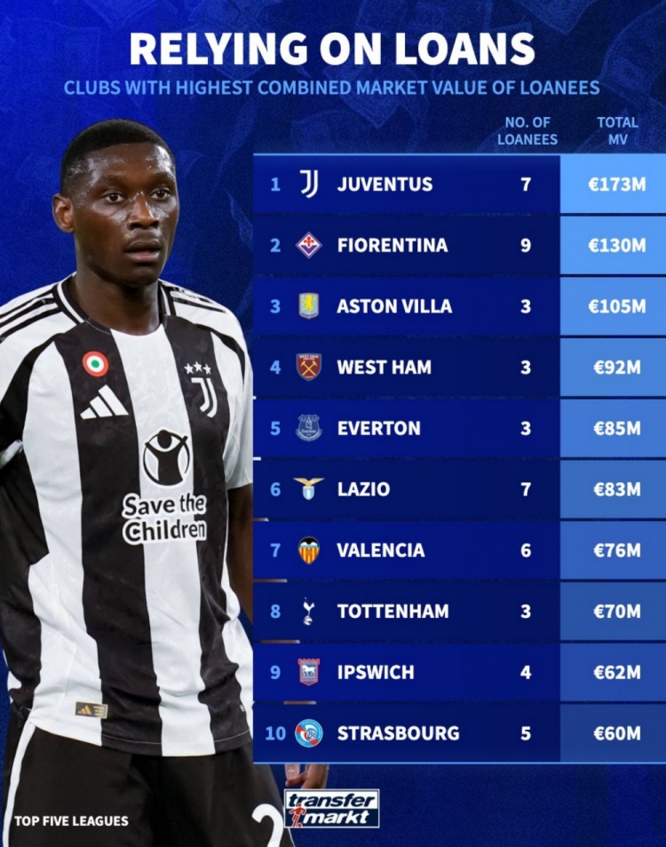 2月19日訊 德轉(zhuǎn)統(tǒng)計(jì)了歐洲5大聯(lián)賽球隊(duì)租借球員身價(jià)排行榜,其中,尤文租借了7名球員,總身價(jià)高達(dá)1.73億歐遙遙領(lǐng)先,佛羅倫薩和維拉排在二三位。