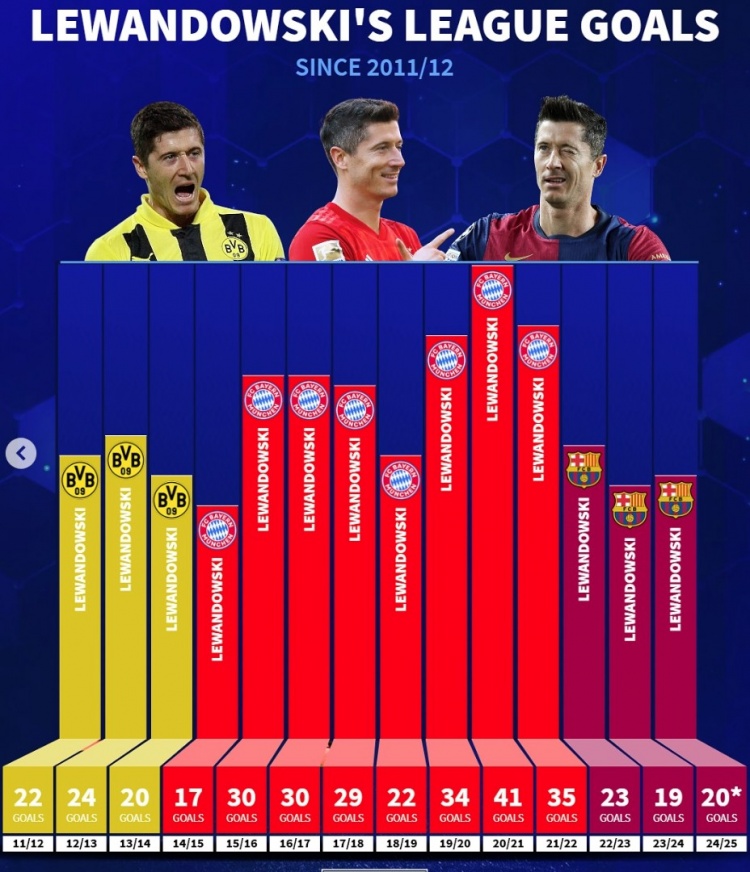 20-21賽季,41球(打破蓋德-穆勒德甲單賽季40球紀(jì)錄)