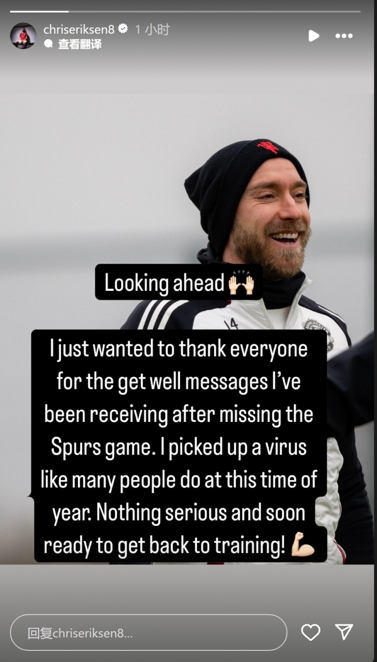 2月19日訊 曼聯(lián)中場埃里克森因病缺席對陣熱刺的比賽,他在社交媒體上發(fā)文,感謝大家的關(guān)心和祝福,并稱很快就能恢復(fù)訓(xùn)練。埃里克森寫道:“展望未來。我只是想感謝大家在我缺席對陣熱刺比賽后發(fā)來的祝福信息,我就像每年這個(gè)時(shí)候的很多人一樣感染了(流感)病毒,沒什么大礙,很快就可以恢復(fù)訓(xùn)練了!” 本文標(biāo)簽: 足球 英超 曼聯(lián)