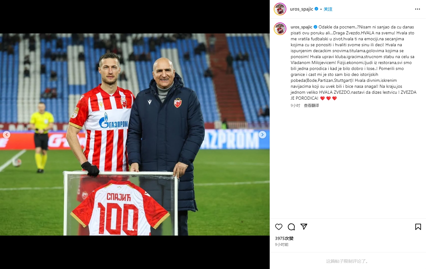 2月19日訊 在壓哨加盟北京國安后,斯帕吉奇在社媒發(fā)文向老東家貝爾格萊德紅星告別。