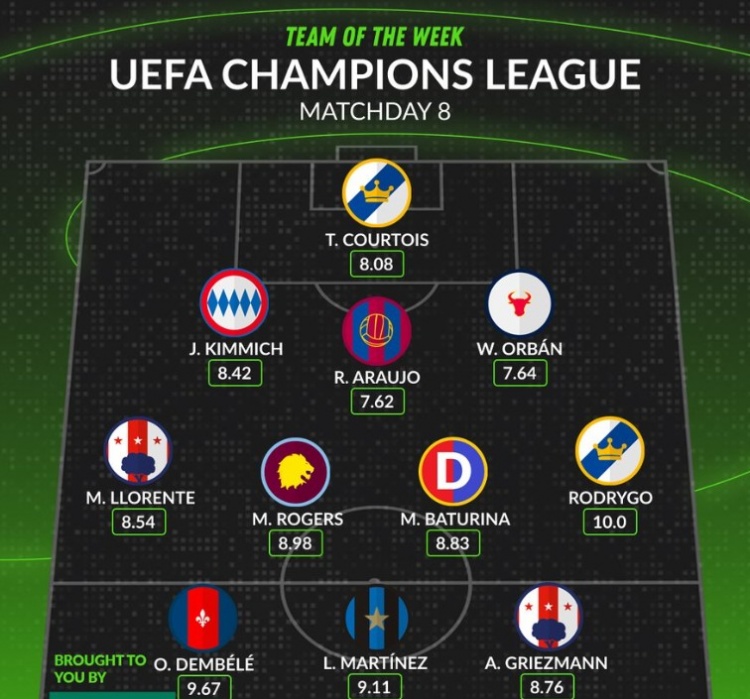 中場(chǎng):馬科斯-略倫特(馬競(jìng),8.54分)、羅杰斯(維拉,8.98分)、巴圖里納(薩格勒布迪納摩,8.83分)、羅德里戈(皇馬,10.0分)
