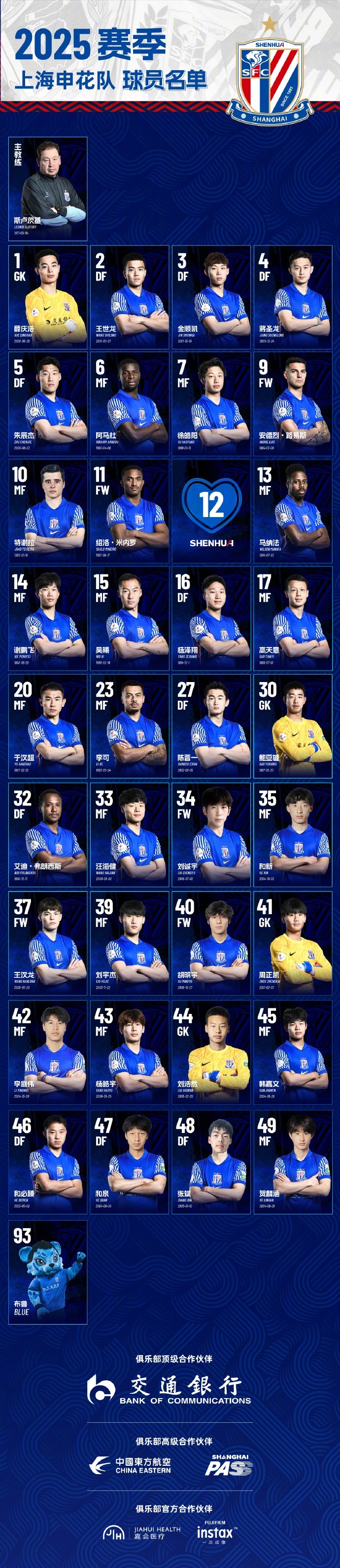 2月20日訊 上海申花官方公布了2025賽季一線隊(duì)球員名單,阿馬杜、路易斯、特謝拉、米內(nèi)羅、馬納法5名外援領(lǐng)銜,吳曦、朱辰杰、于漢超、李可、劉誠宇等球員在列,共35名球員入選。