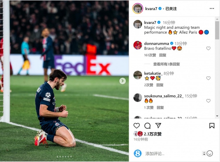 2月20日訊 歐冠淘汰賽附加賽次回合比賽,克瓦拉茨赫利亞傳射建功,攻入加盟巴黎以來首粒歐冠進(jìn)球,幫助巴黎主場7-0擊敗布雷斯特,兩回合總比分10-0晉級(jí)。克瓦拉茨赫利亞在社交媒體上曬出慶祝的照片,配文:“神奇的夜晚,出色的團(tuán)隊(duì)表現(xiàn)。加油巴黎!” 本文標(biāo)簽: 足球 法甲 巴黎圣日耳曼 歐冠