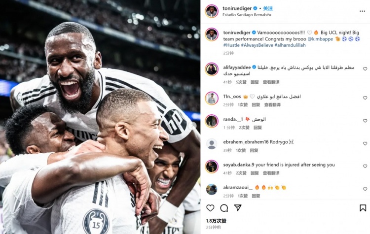 2月20日訊 皇馬在本輪歐冠3-1擊敗曼城,呂迪格傷愈復(fù)出首發(fā)踢滿全場。他也在賽后通過社媒曬出自己和隊友們相擁慶祝的合照,并配文:“太棒了?。?!重要的歐冠勝利,出色的團隊表現(xiàn)!”“也祝賀我的兄弟@姆巴佩????戴帽???”。 本文標(biāo)簽: 足球 西甲 皇家馬德里 歐冠 英超 曼城