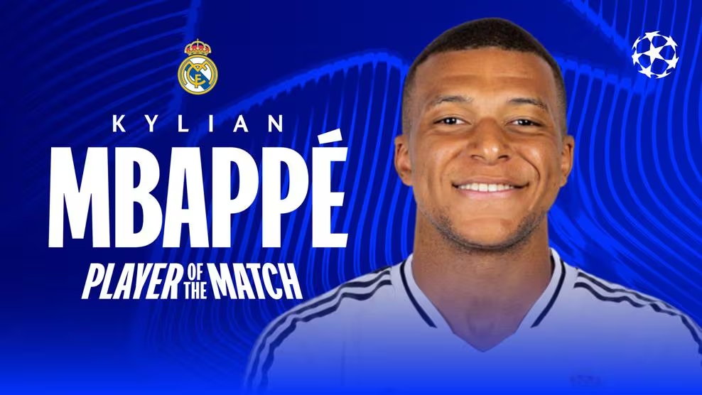 2月20日訊 皇馬在本輪歐冠3-1擊敗曼城,上演帽子戲法的姆巴佩在賽后被官方評為本場最佳球員。