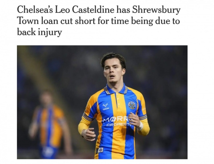 2月20日訊 據The Athletic報道,切爾西外租至什魯斯伯里的19歲中場卡斯爾丁遭遇下背部輕微應力性骨折傷情,將回到切爾西接受檢查和治療。