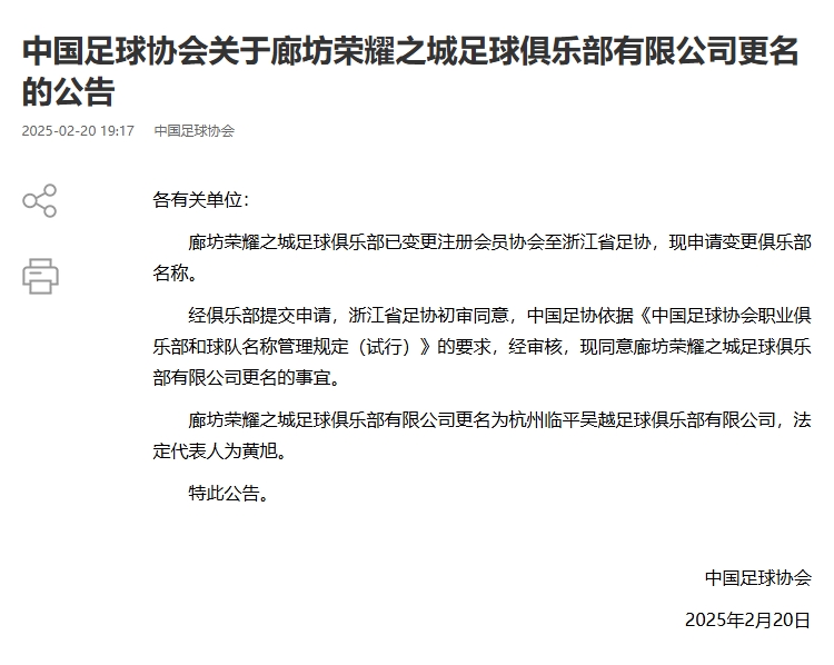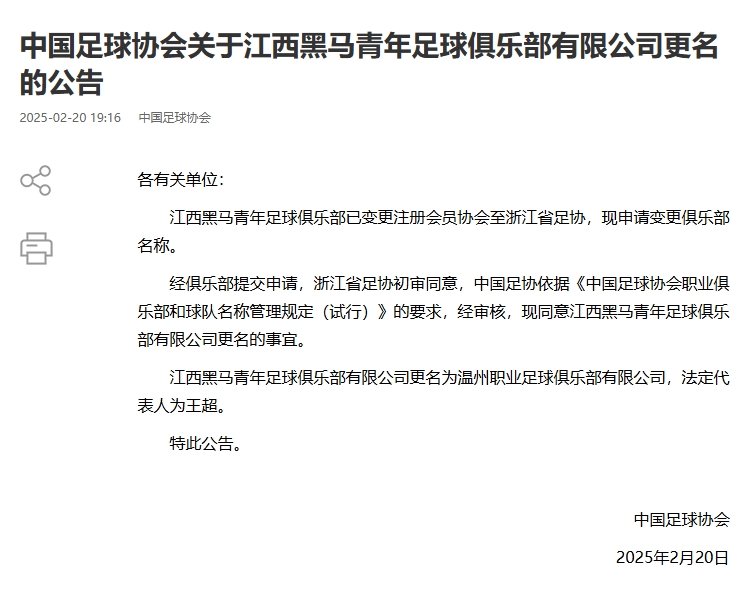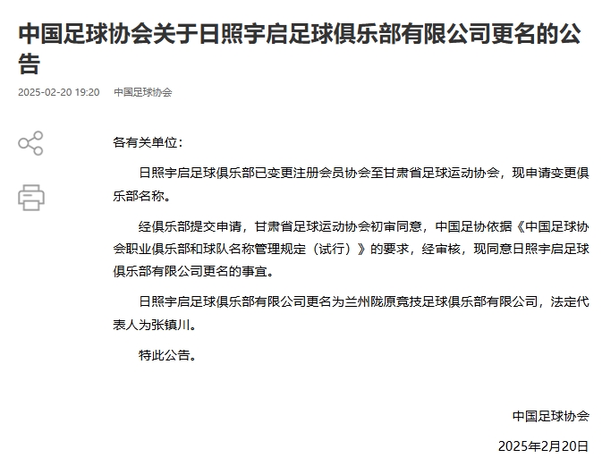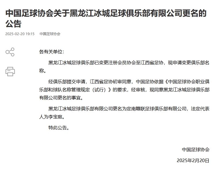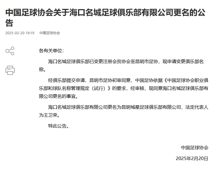02月20日訊 中國(guó)足協(xié)官宣5家職業(yè)足球俱樂(lè)部的更名事宜,此前這5家俱樂(lè)部已經(jīng)變更注冊(cè)會(huì)員協(xié)會(huì),也就是俗稱的“異地搬遷”。