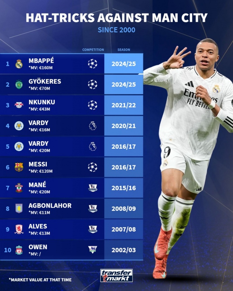 德國轉會市場盤點了本世紀以來對陣曼城戴帽的球員,梅西、姆巴佩、歐文在列,瓦爾迪2次對陣曼城戴帽。