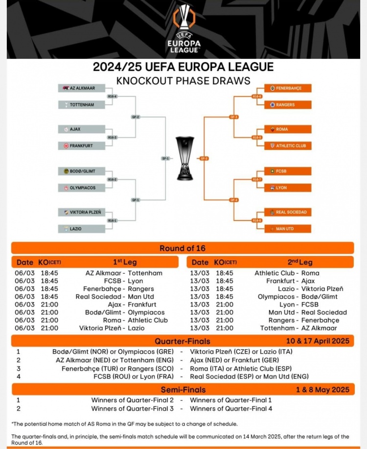 2月22日訊 歐足聯(lián)官方公布了歐聯(lián)杯1/8決賽的開球時(shí)間,首回合皇家社會(huì)vs曼聯(lián)3月7日1點(diǎn)45分開球,羅馬vs畢爾巴鄂3月7日4點(diǎn)開球。