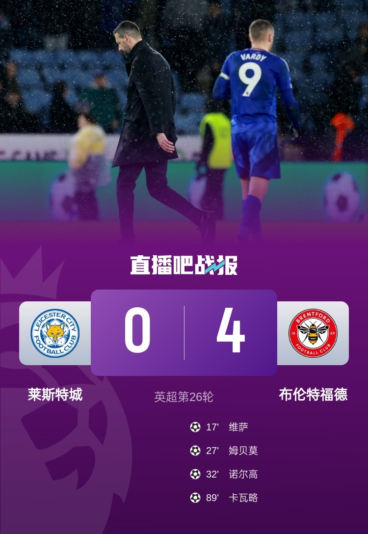 英超第26輪,萊斯特城主場0-4慘敗布倫特福德,遭遇英超3連敗。