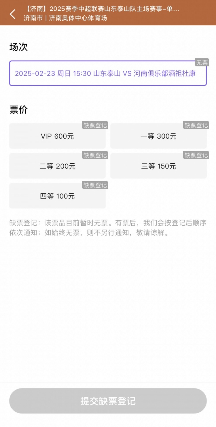 2月22日訊 2月23日下午,中超聯(lián)賽首輪山東泰山將在主場對陣河南隊。據(jù)購票平臺顯示,本場比賽球票已售罄。泰山隊21日正式發(fā)布本場比賽的票價,最高600元,最低100元,還有150元、200元和300元三個檔的球票可供球迷選擇。從整體票價看,泰山隊部分檔位的票價有所提升。球票銷售開始后,泰山隊球迷的購票速度很快,目前球票已經(jīng)售罄。 本文標(biāo)簽: 足球 中超 中國足球 山東泰山 河南