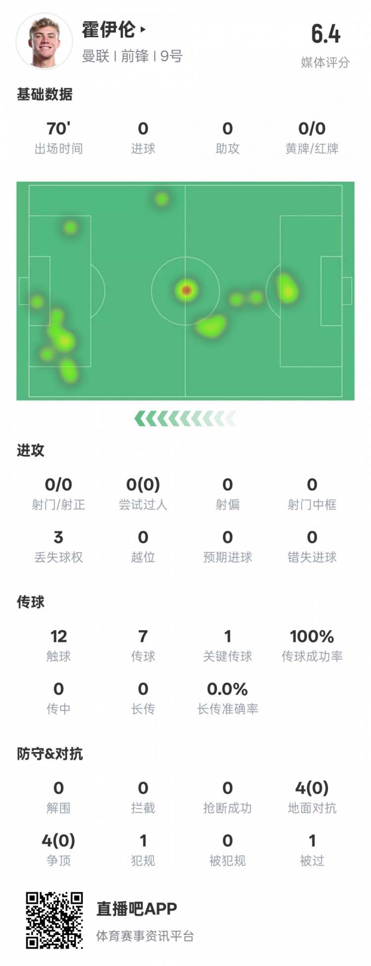 2月22日訊 英超第26輪,曼聯(lián)客戰(zhàn)埃弗頓,霍伊倫首發(fā)出戰(zhàn),沒有完成射門,貢獻1次關(guān)鍵傳球,傳球成功率100%,4次地面對抗以及4次爭頂均失敗,評分6.4。