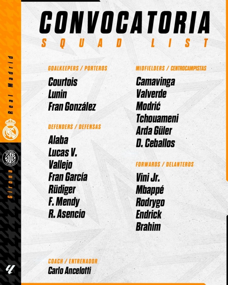 2月22日訊 北京時(shí)間明晚23:15,皇馬將在西甲第25輪中迎戰(zhàn)赫羅納。賽前,皇馬公布了將出戰(zhàn)本場(chǎng)比賽的大名單。其中,貝林厄姆因染紅停賽,姆巴佩、維尼修斯領(lǐng)銜,巴斯克斯、阿拉巴、呂迪格等人入選。
