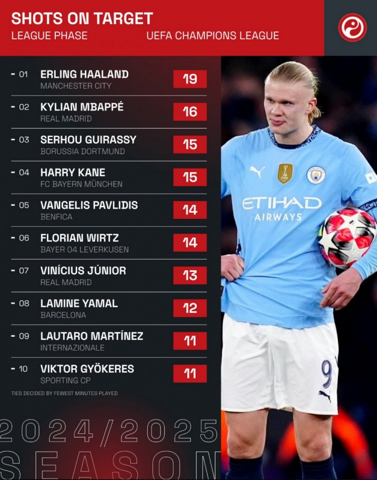 1月31日訊 歐冠聯(lián)賽階段已經(jīng)正式收官,Squawka統(tǒng)計(jì)了聯(lián)賽階段所有球員射正次數(shù)的排行榜,其中,哈蘭德和姆巴佩排在前二。