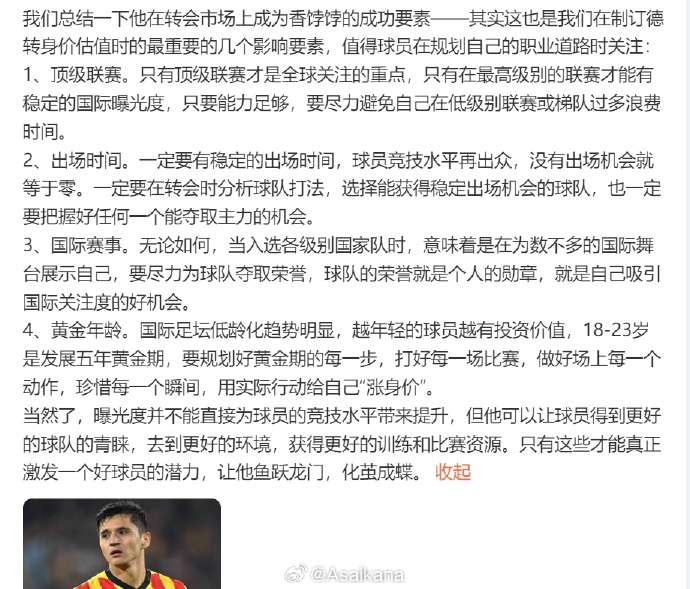 我之前寫了篇介紹胡桑諾夫的長微博,提出了一個(gè)球員曝光度對(duì)于球員職業(yè)生涯和能力影響的問題。其實(shí)當(dāng)時(shí)有很大程度上是寫給準(zhǔn)備迎接各級(jí)大賽的各年齡段國足,尤其是當(dāng)時(shí)正在備戰(zhàn)亞青賽的國青隊(duì)員和家長們看的。很巧,我看到賽后有很多人也都在為國青球員們失去了在世界球探面前展現(xiàn)自己的機(jī)會(huì)而惋惜不已。一個(gè)有才華的球員,只有在足夠的曝光度下,才能從被忽視的角落走向舞臺(tái)的中央,迎接屬于自己的機(jī)遇與挑戰(zhàn)。只有當(dāng)他站在更廣闊的平臺(tái)上,才能借助更強(qiáng)大的資源,迅速提升自我,釋放潛力,達(dá)到職業(yè)巔峰。但是真的很可惜,可惜到我已經(jīng)不想去回想下午那場(chǎng)球了。