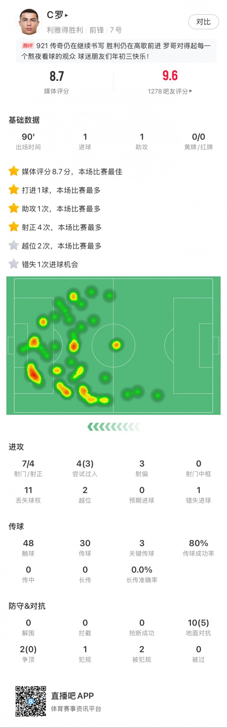 1月31日訊 沙特聯(lián)第18輪,利雅得勝利客場(chǎng)2-1戰(zhàn)勝布賴代先鋒。C羅全場(chǎng)數(shù)據(jù):