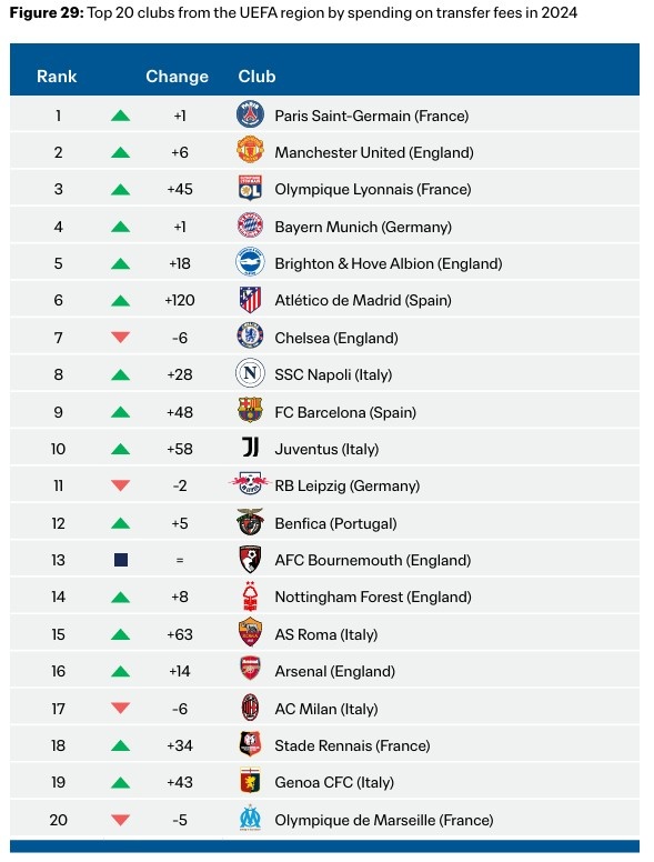 2024年歐足聯(lián)俱樂(lè)部引援花銷榜: