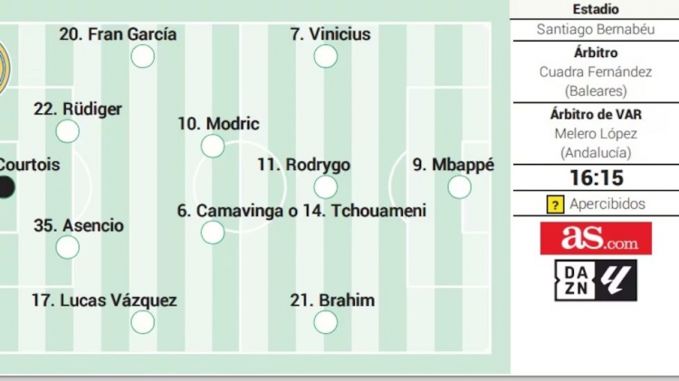 本場比賽,貝林厄姆停賽缺陣,羅德里戈將拉回中路,在姆巴佩身后活動,維尼修斯站左路,迪亞斯站右路。