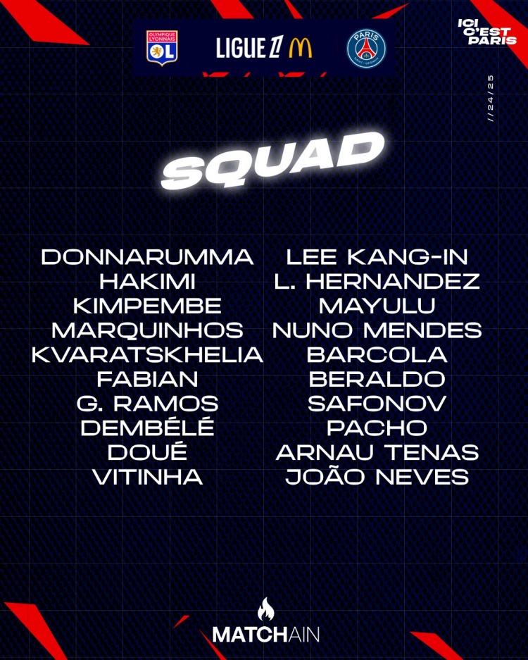 2月23日訊 北京時間明天凌晨3點45分,巴黎將在法甲第23輪比賽中客場對陣里昂。巴黎公布了此役的球員名單,登貝萊、克瓦拉茨赫利亞、阿什拉夫、若昂-內(nèi)維斯在列。