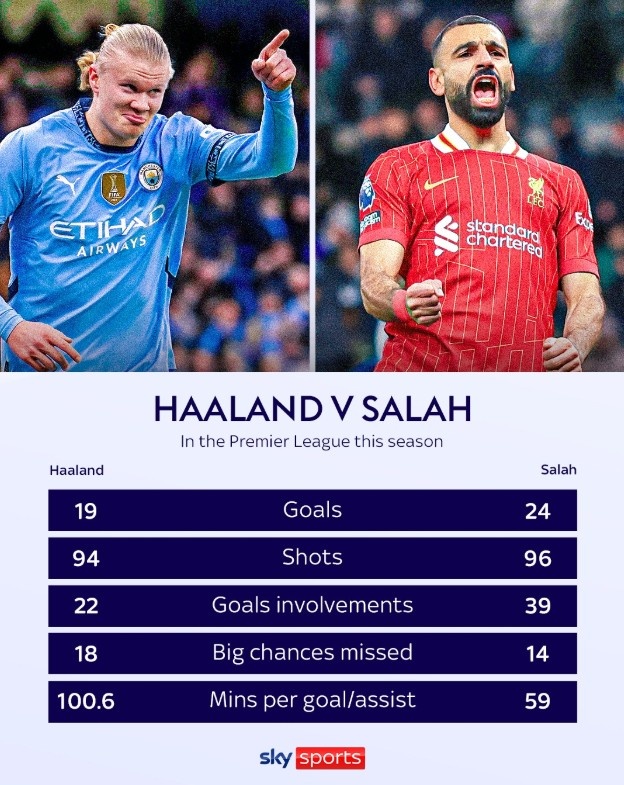 2月23日訊 在本輪英超曼城對陣?yán)锲值慕裹c(diǎn)戰(zhàn)前,天空體育對比了兩隊當(dāng)家前鋒哈蘭德和薩拉赫本賽季聯(lián)賽的數(shù)據(jù)。