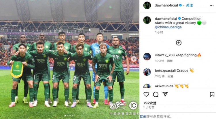 本場(chǎng)比賽國(guó)安新援達(dá)萬(wàn)首發(fā)出戰(zhàn),上演國(guó)安首秀,賽后他在社媒曬出比賽照慶祝勝利,并配文寫道:“以一場(chǎng)偉大的勝利開啟賽季征程?!?/p>
