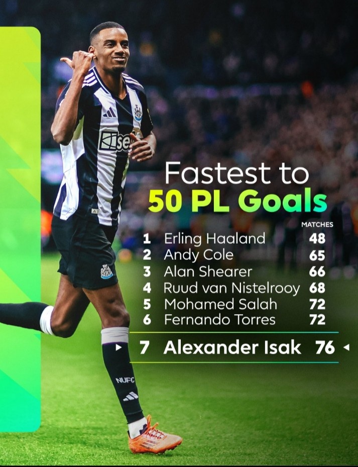英超官方盤點了最快達成50粒英超進球榜單,其中伊薩克排在第7位,具體如下: