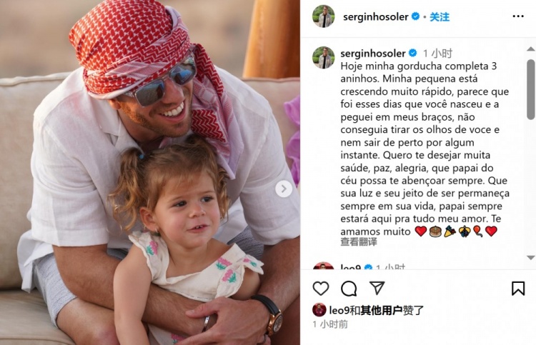 2月24日訊 國安中場塞爾吉尼奧更新社媒,他為三歲的女兒送上生日祝福。