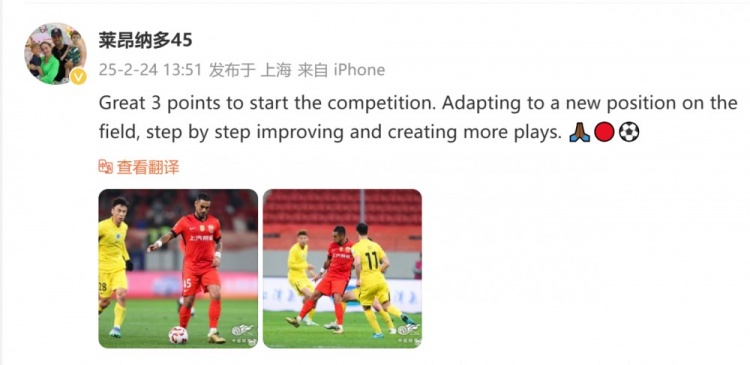 2月24日訊 本輪中超,海港3-1擊敗深圳新鵬城,萊昂納多為海港首發(fā)出戰(zhàn)全場&出任前腰。萊昂納多賽后更新社媒:拿下三分開啟新賽季,我正在適應新的場上位置,得逐步提升表現(xiàn),創(chuàng)造更多出場機會。 本文標簽: 足球 中超 中國足球 上海海港