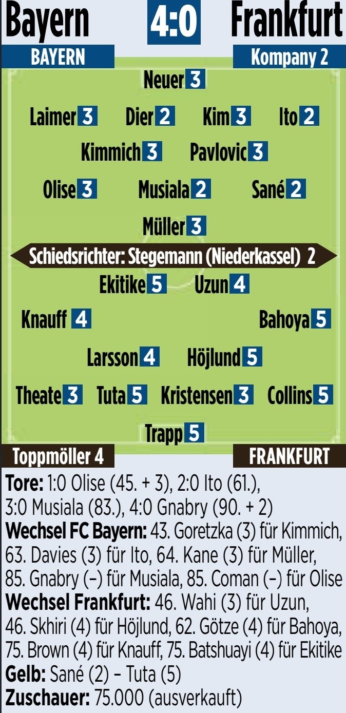 2月24日訊 本輪德甲比賽,拜仁主場4-0戰(zhàn)勝法蘭克福。賽后《圖片報》對于兩隊表現(xiàn)進行了評分。