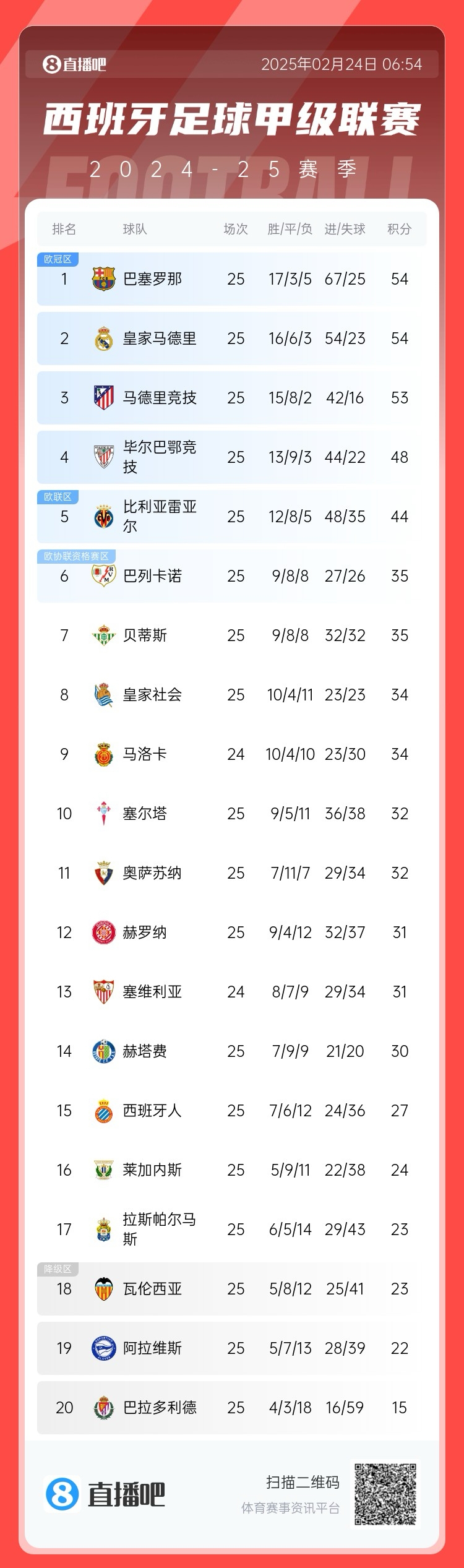 西甲積分榜:巴薩榜首,與皇馬同分、只領(lǐng)先馬競1分。