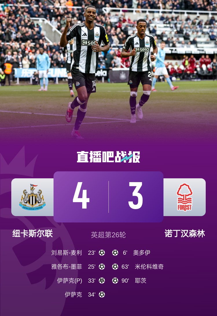 英超第26輪,紐卡4-3諾丁漢森林。上半場,奧多伊前場斷球后轟出世界波破門,麥利和墨菲3分鐘內(nèi)連進(jìn)兩球,埃納手球送點(diǎn),伊薩克點(diǎn)射得手,隨后他梅開二度;下半場,沙爾頭球中柱,米倫科維奇蝎子擺尾扳回一球,耶茨補(bǔ)時(shí)階段再追一球。