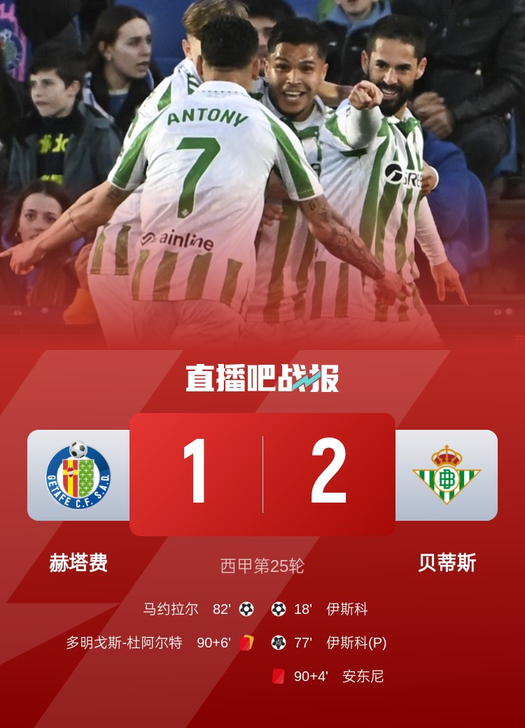 西甲第25輪,貝蒂斯2-1擊敗赫塔費(fèi)。上半場,安東尼長途奔襲連續(xù)過人助攻伊斯科破門;下半場,安東尼錯(cuò)失良機(jī),庫喬造點(diǎn),伊斯科點(diǎn)射完成雙響,馬約拉爾扳回一球,補(bǔ)時(shí)安東尼背后鏟人被直紅罰下,多明戈斯-杜阿爾特2黃變1紅也被罰下。