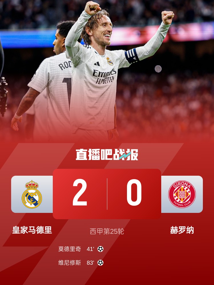 西甲第25輪,皇馬2-0赫羅納。上半場,庫爾圖瓦救險(xiǎn)撲出范德貝克近距離射門,莫德里奇世界波破門;下半場,姆巴佩助攻維尼修斯破門
