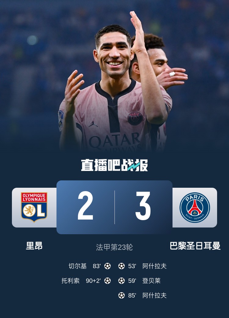 法甲第23輪,巴黎圣日耳曼3-2里昂。上半場,阿什拉夫犯規(guī)染黃,雙方互交白卷;下半場,阿什拉夫打入兩球上演梅開二度,登貝萊破門打入個(gè)人聯(lián)賽第17球,切爾基和托利索為里昂扳回兩球。