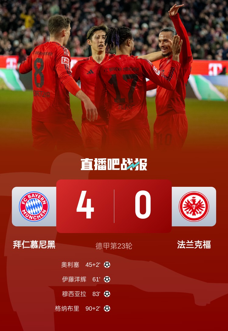 德甲第23輪,拜仁4-0法蘭克福。上半場,基米希傷退,奧利塞破門;下半場,伊藤洋輝打進(jìn)自己的拜仁生涯首球,穆西亞拉一條龍,格納布里錦上添花。