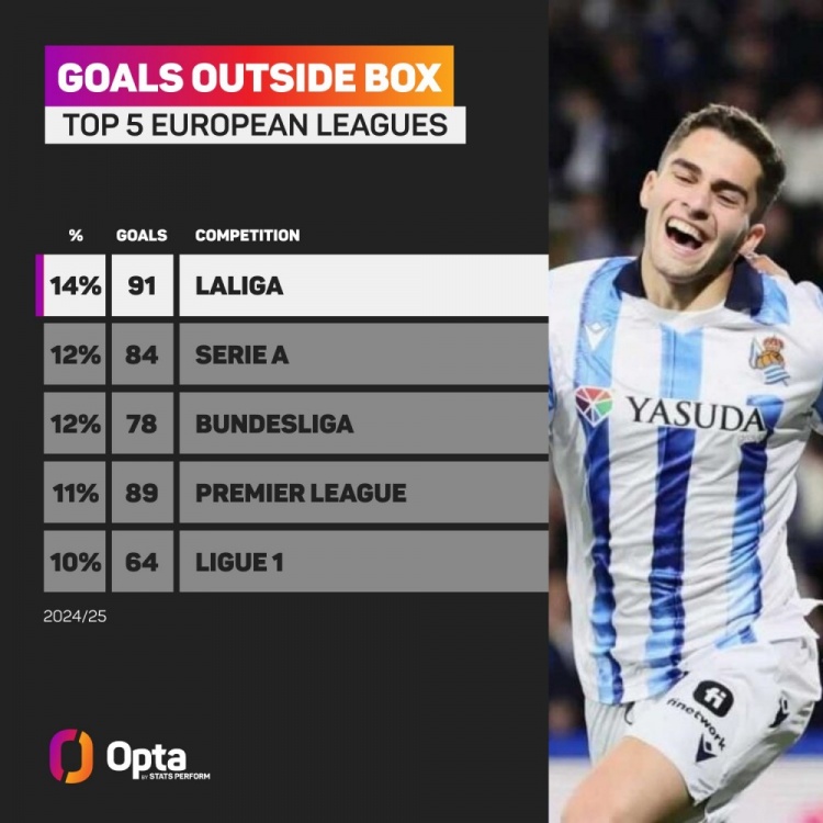2月24日訊 根據(jù)Opta的數(shù)據(jù),西甲本賽季649粒進(jìn)球中有91粒來自于禁區(qū)外,占比14%是五大聯(lián)賽最多的。五大聯(lián)賽本賽季禁區(qū)外進(jìn)球占比:西甲:91粒、14%意甲:84粒、12%德甲:78粒、12%英超:89粒、11%法甲:64粒、10% 本文標(biāo)簽: 足球 英超 西甲 意甲 德甲 法甲