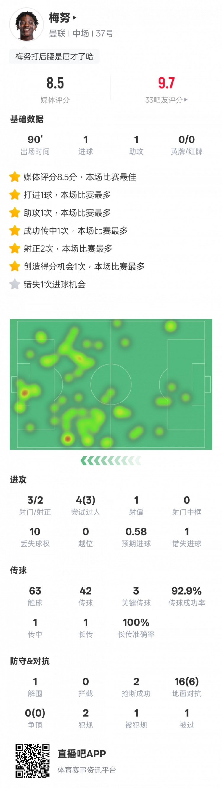 梅努本場(chǎng)比賽數(shù)據(jù)如下: